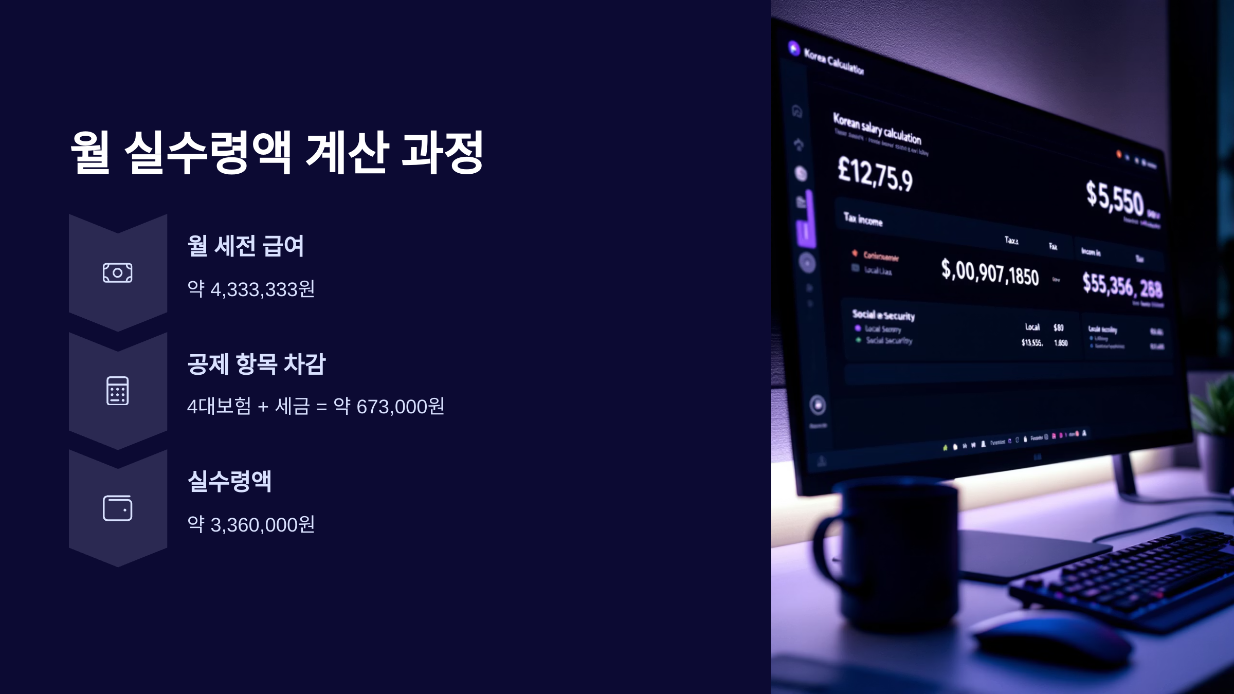 이러한 공제 항목을 합치면 약 673,000원이 빠지고, 결국 월 실수령액은 3,360,000원 안팎이 돼요. 이 금액은 부양가족 유무나 기타 소득에 따라 다소 달라질 수 있어요.