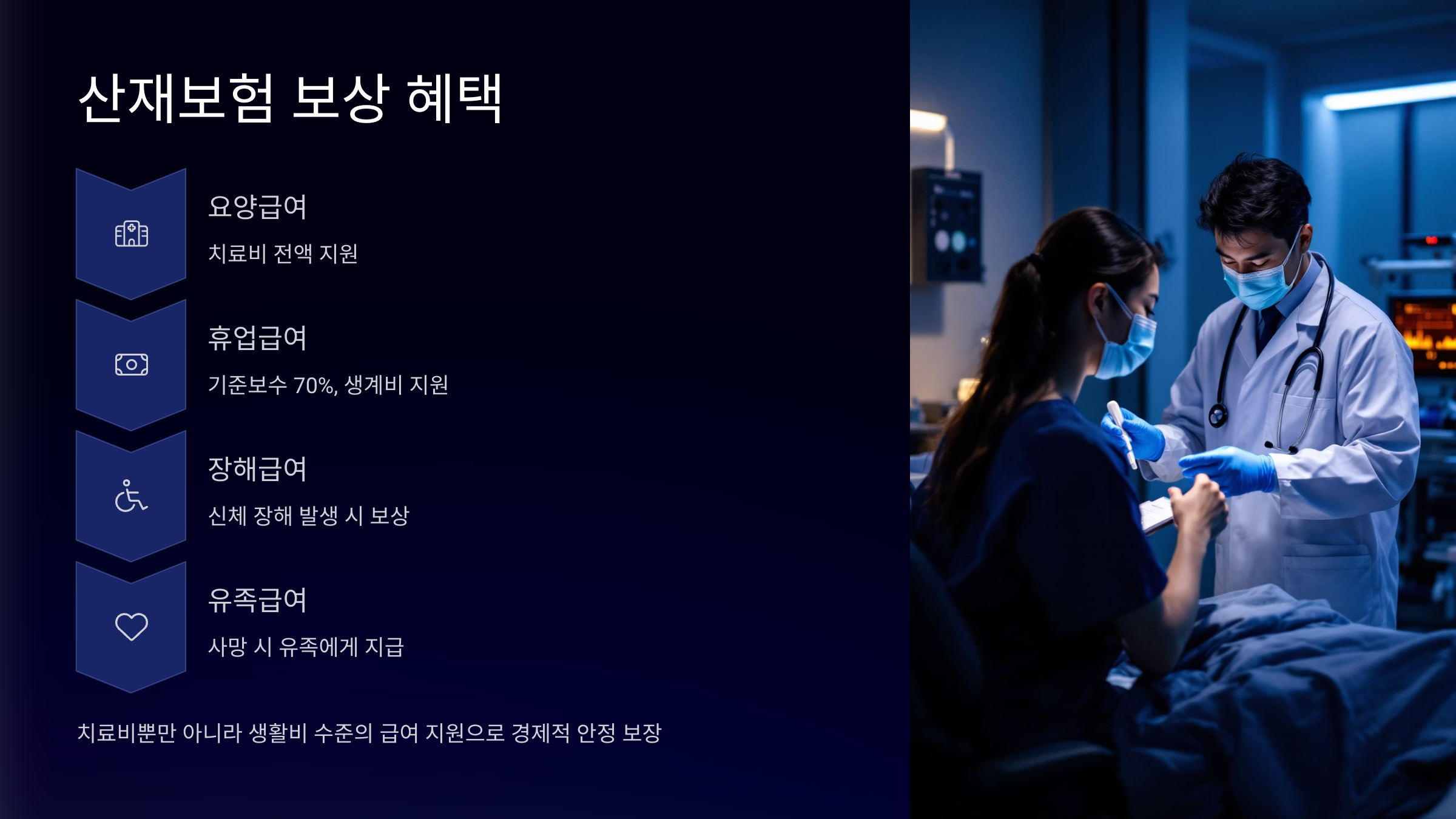 1인 자영업자가 산재보험에 가입하면 예상치 못한 사고나 질병이 발생했을 때 다양한 형태의 보상과 지원을 받을 수 있어요. 단순히 병원비만 나오는 게 아니라, 생활비 수준의 급여까지 지원되기 때문에 사고 시 경제적 충격을 크게 줄일 수 있어요.