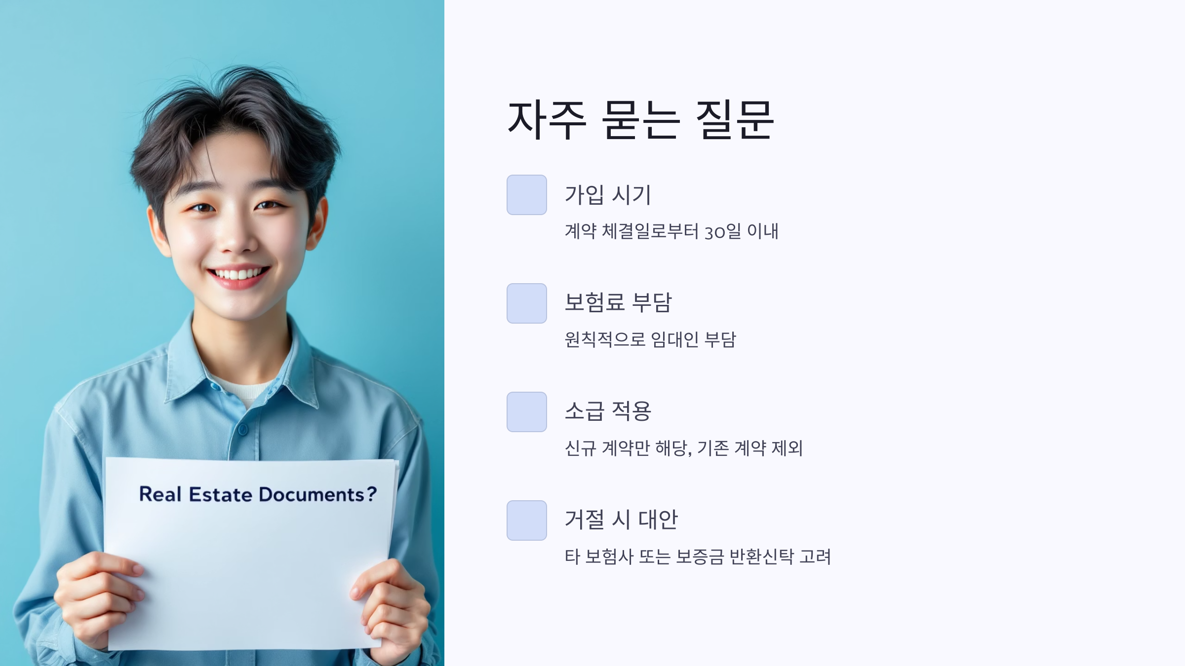 하지만 예외도 있어요. 보증금이 1,000만 원 미만인 경우, 또는 임대차 기간이 6개월 미만인 경우에는 보증보험 가입 의무가 발생하지 않아요. 또한 임차인이 서면으로 ‘보험 가입을 원치 않는다’는 의사를 밝힌 경우도 가입 예외로 처리될 수 있어요. 단, 이 경우 임차인이 향후 반환을 요구해도 보장이 안 되기 때문에 주의가 필요해요.