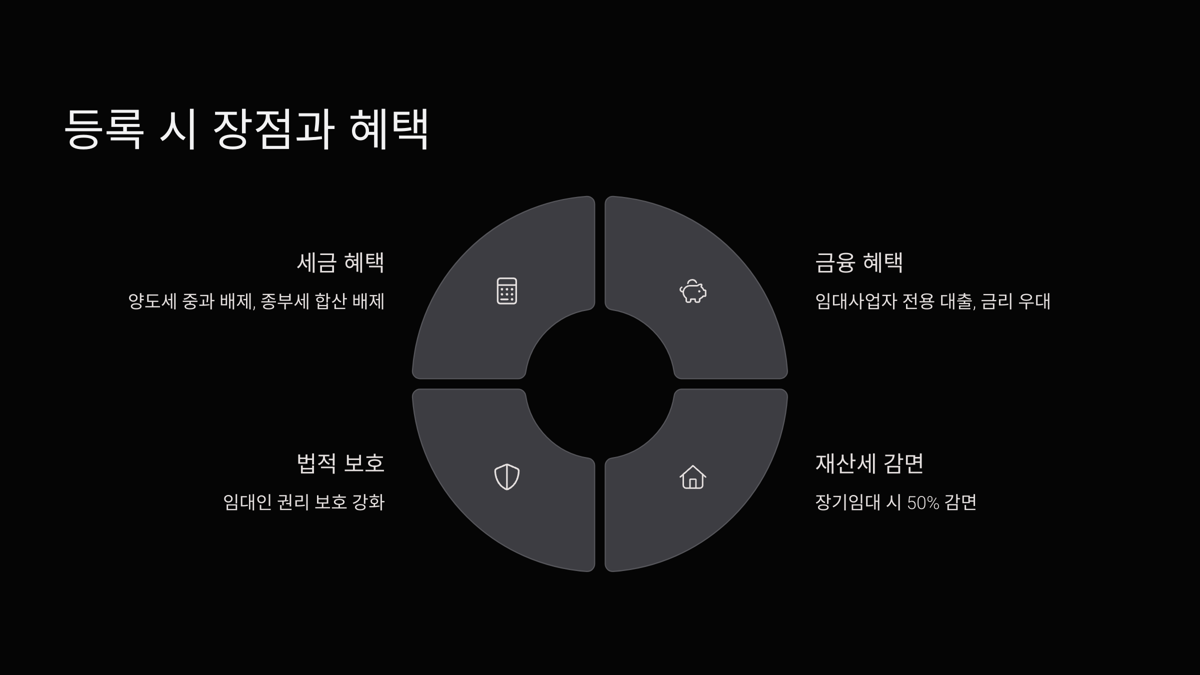 등록 임대사업자가 되면, 임대차 계약 신고, 임대료 증액 제한, 임대 의무기간 등 다양한 규제를 따르게 돼요. 하지만 그에 상응하는 세제 감면, 양도세 비과세 혜택, 건강보험료 산정 시 제외 등 경제적 이점도 큽니다. 특히 장기임대사업자에게는 지방세 감면, 종합부동산세 합산 배제 등의 강력한 혜택이 주어져요.