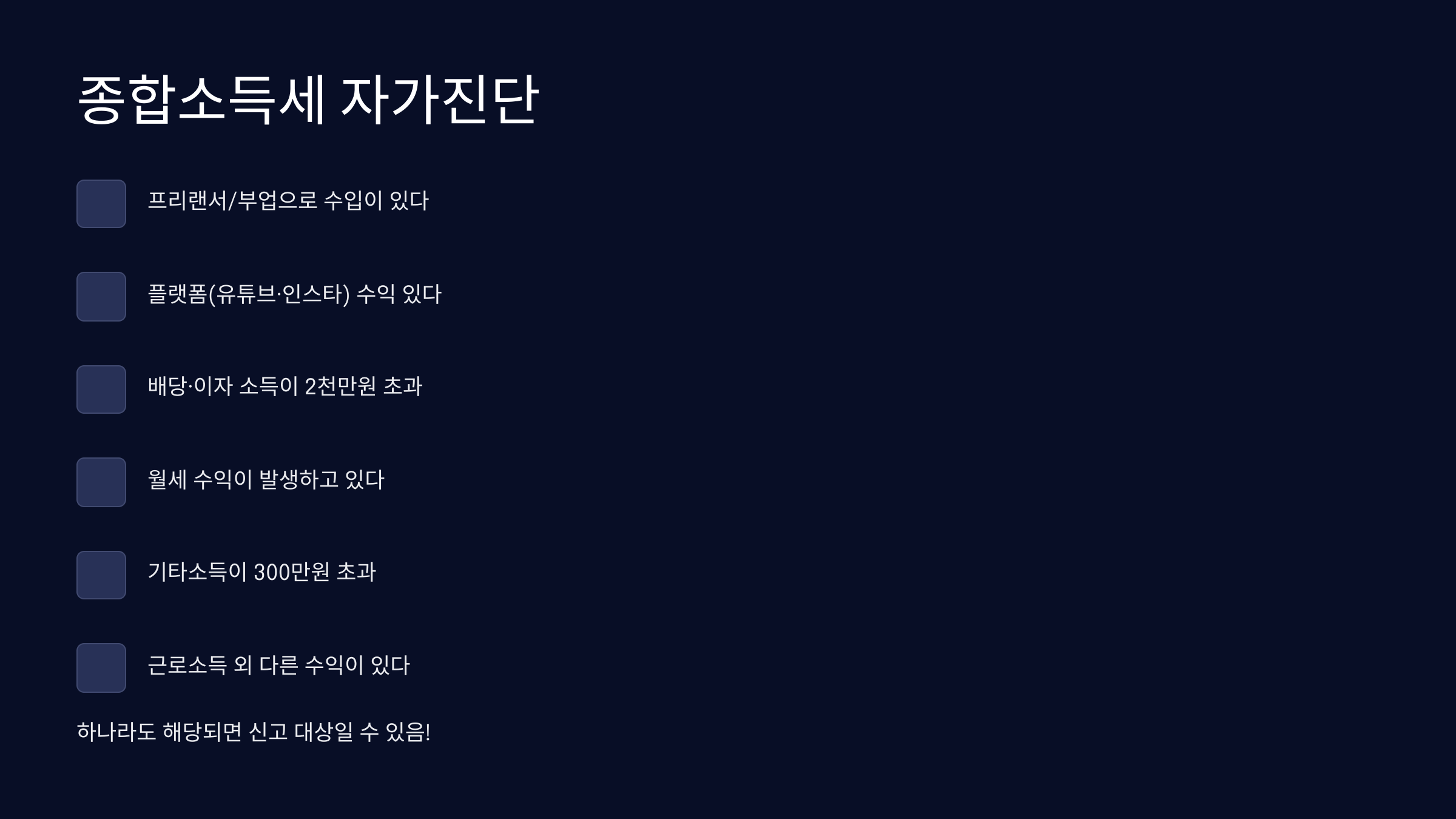 아래 항목 중 하나라도 해당된다면, 종합소득세 신고를 꼭 확인해야 해요. 그리고 만약 두 개 이상이라면 더더욱 확실히 신고 대상이에요!