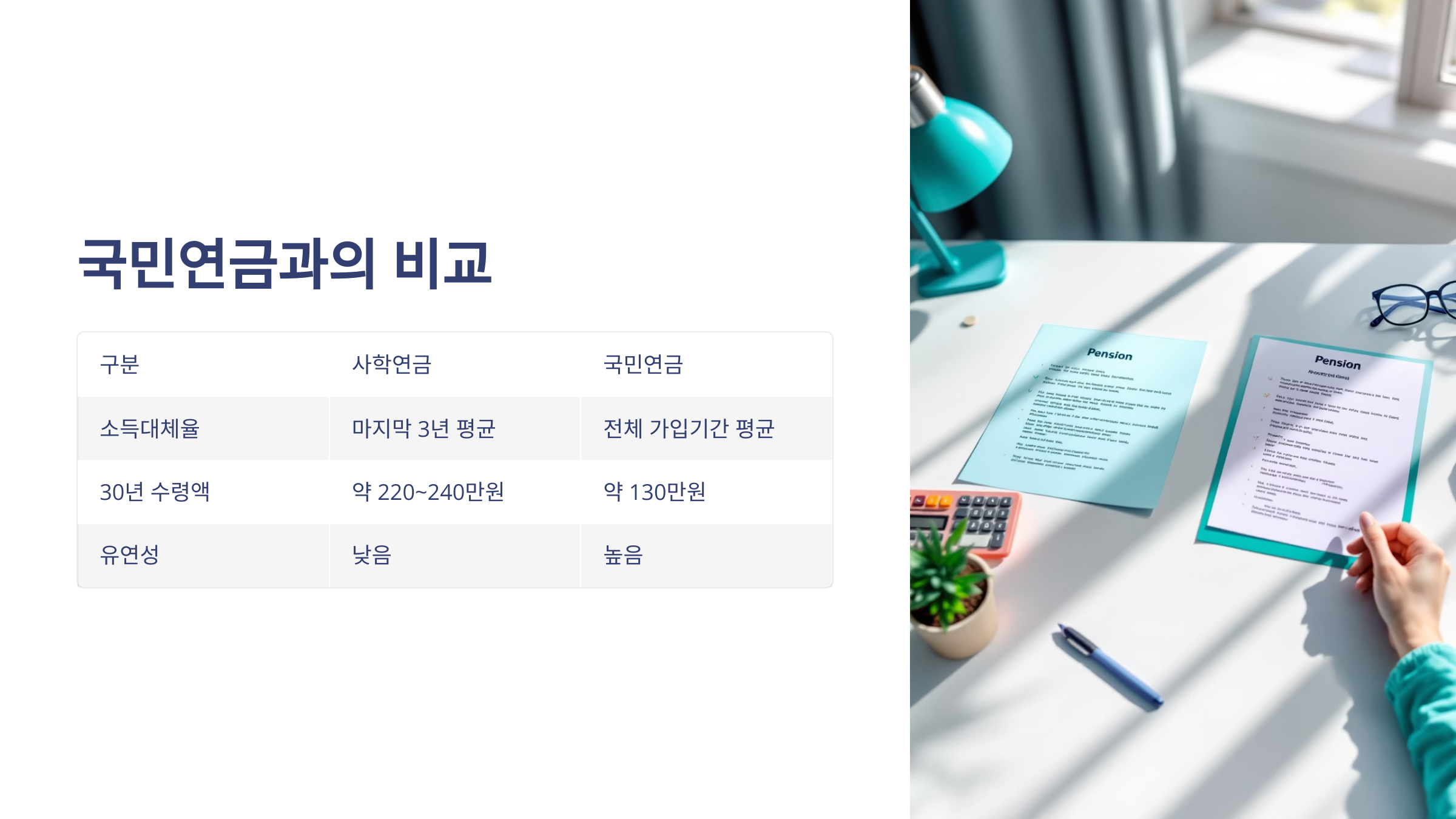 | 수령액 | 국민연금보다 높음 | 단기 재직자 불리 |