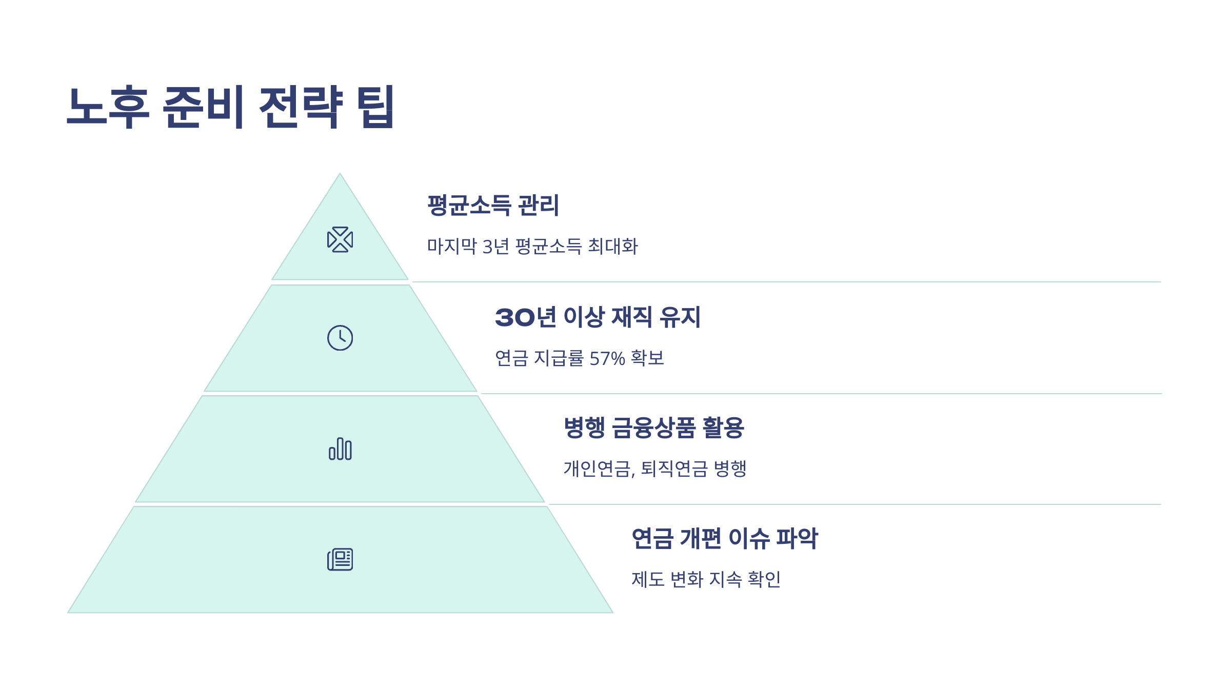 두 번째는 ‘30년 이상 재직 유지’ 전략이에요. 연금 지급률이 1년에 1.9%씩 누적되므로, 30년 재직 시 57%가 적용돼요. 근속이 길수록 유리하니 조기 퇴직을 최소화하는 것이 좋아요.