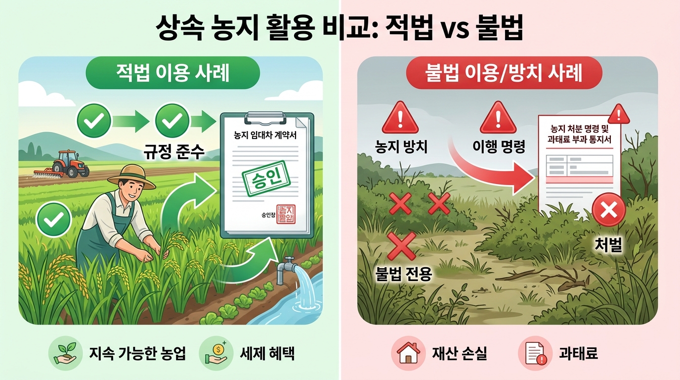 상속받은 농지를 본인이 직접 경작하거나 임대차를 통해 합법적으로 경작 중이라면 큰 문제는 없습니다. 하지만 장기간 방치되었거나 다른 용도로 사용 중이라면 조사 과정에서 시정 요구를 받을 수 있습니다.