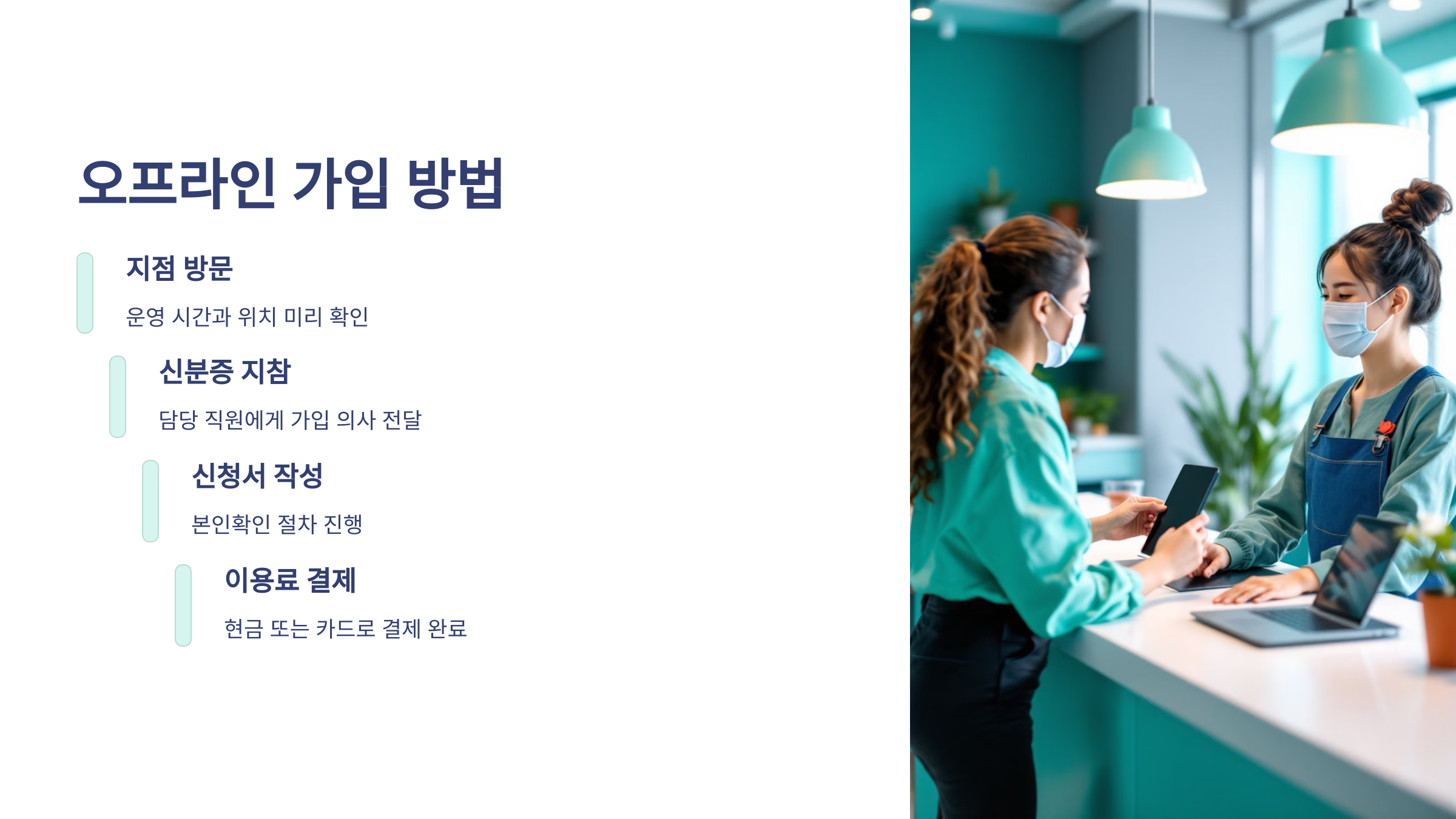 - 신분증을 지참하고 담당 직원에게 서비스 가입 의사를 밝힙니다. 궁금한 점이 있다면 주저하지 말고 질문하세요! 친절하게 안내해 드릴 겁니다.