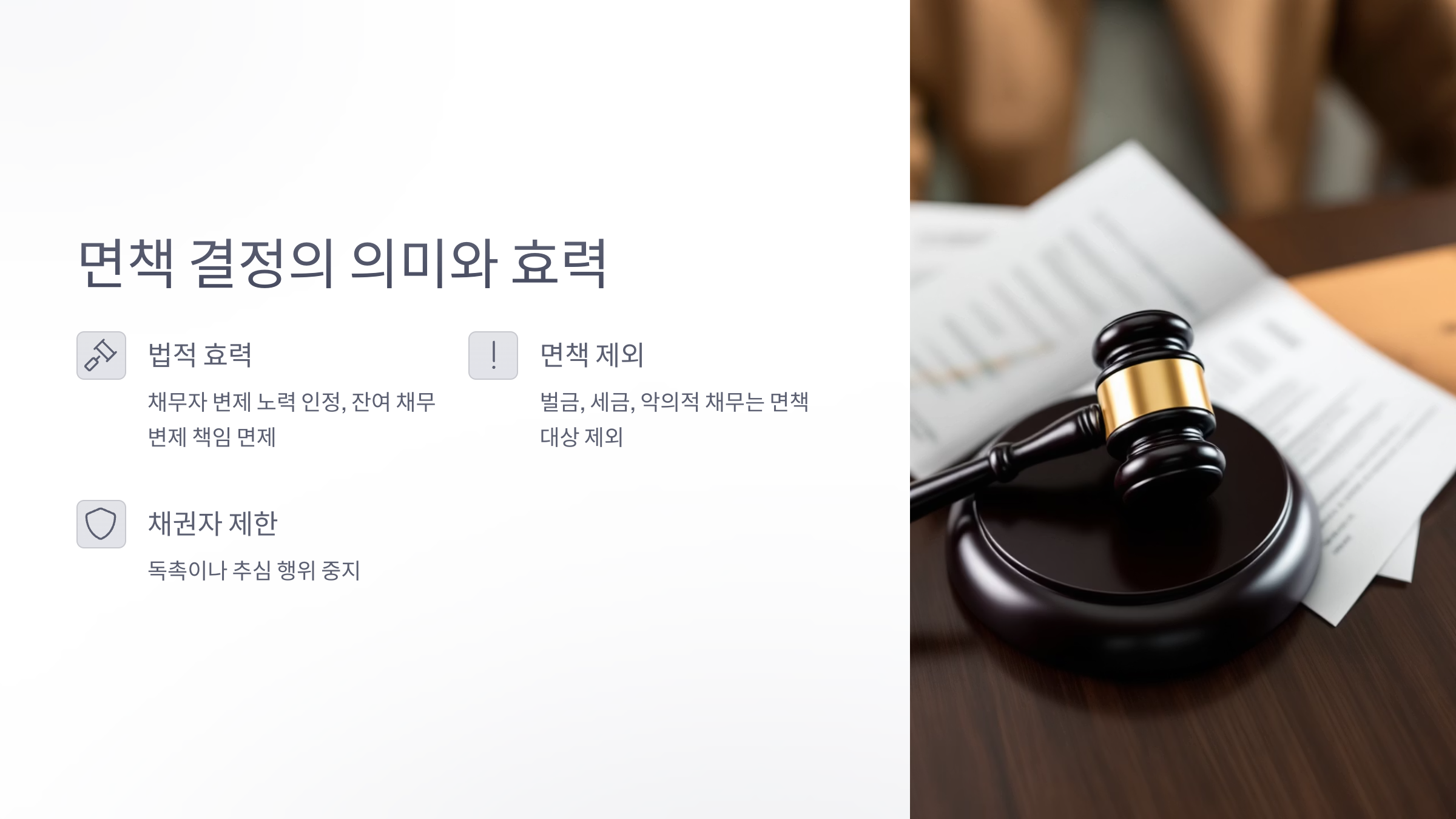 면책 결정을 받으면 채권자들은 더 이상 돈을 요구할 수 없고, 독촉이나 추심 행위도 중지돼요. 이는 채무자에게 굉장히 큰 심리적 안정을 가져다주는 효과도 있죠.