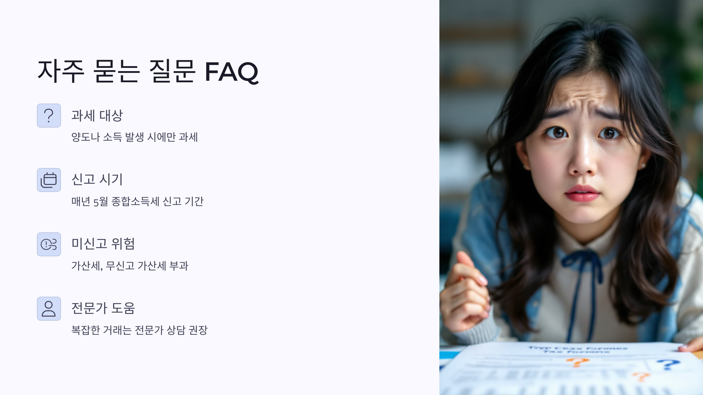 A8. 단순 거래는 직접 신고 가능하지만, 거래량이 많거나 다양한 소득이 있다면 전문가 도움을 권장합니다.