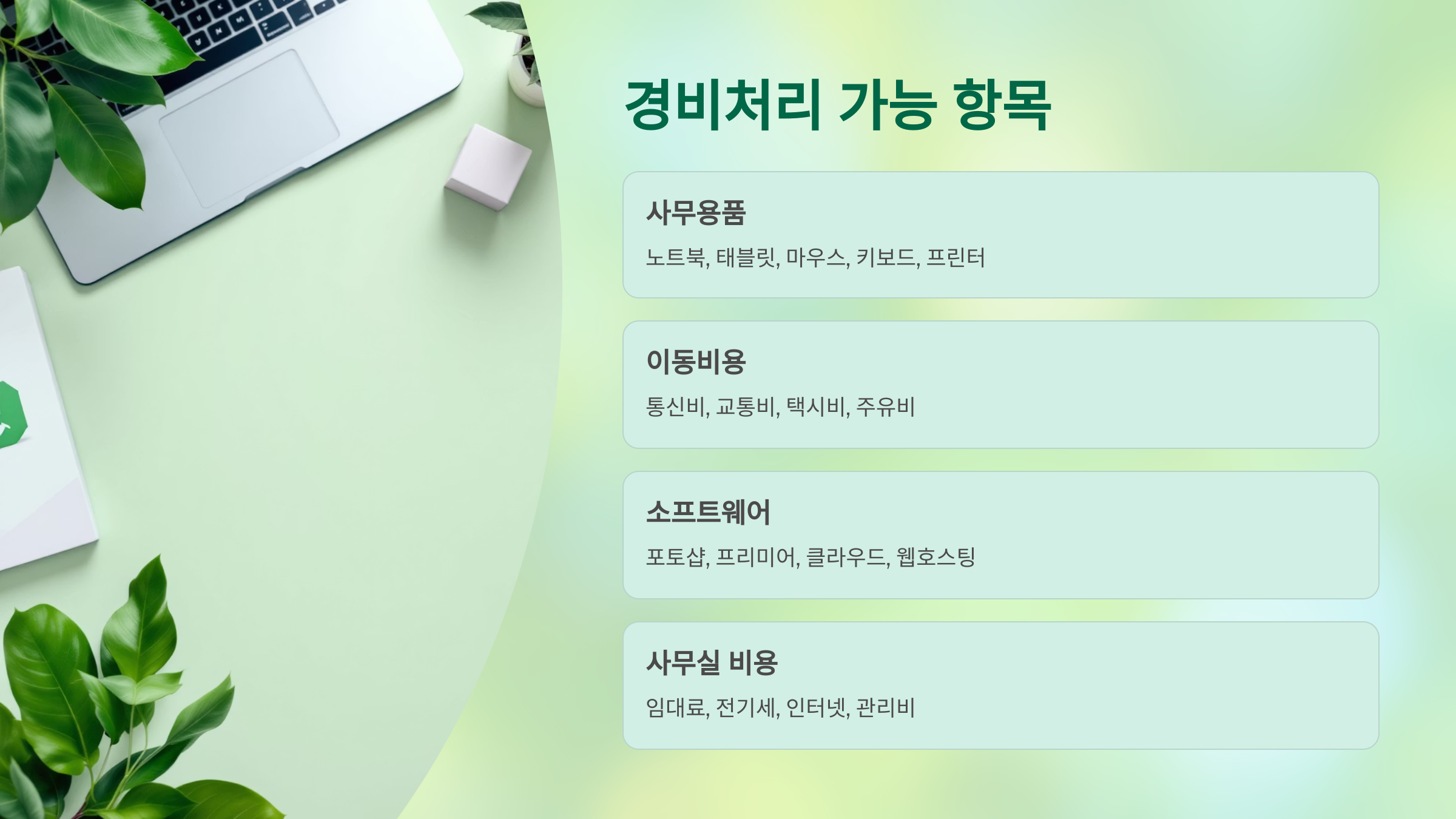 이제 다음은 정말 실전에서 중요한 내용! 어떤 항목들이 ‘경비처리’가 되는지 항목별로 정리해볼게요. 절세 실수 줄이려면 이 내용은 꼭 체크하세요!