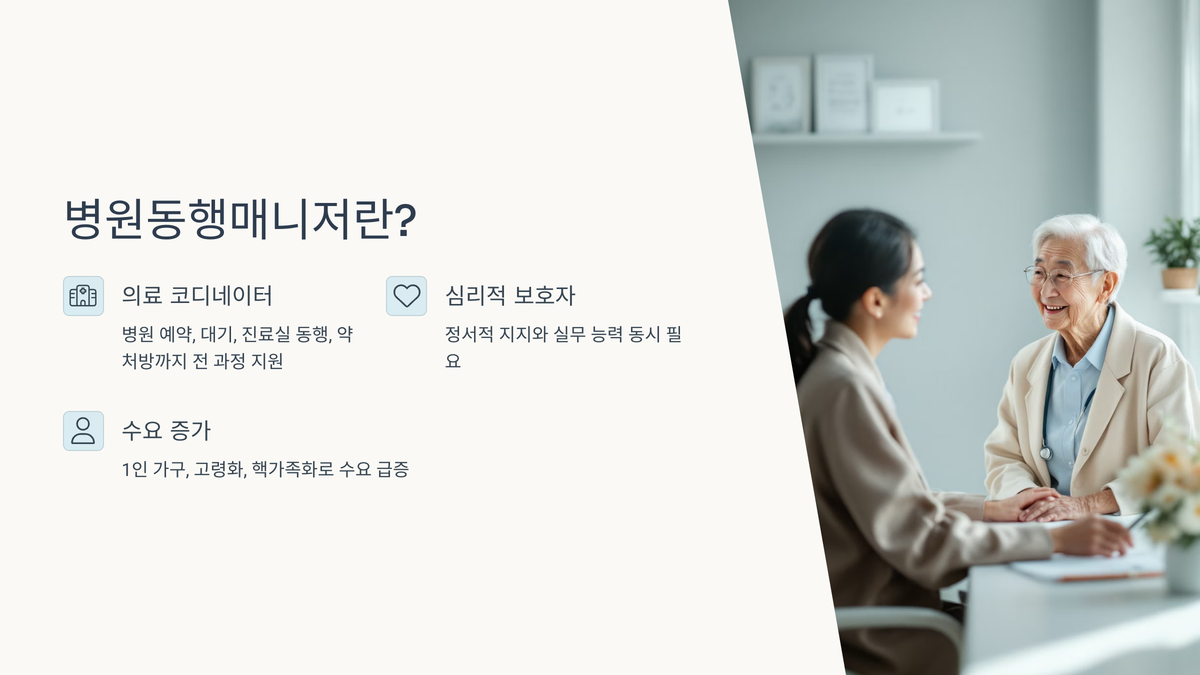 고령화 시대에 맞춰 새롭게 주목받고 있는 직업 중 하나가 바로 병원동행매니저예요. 특히 혼자 병원에 가기 어려운 노인, 장애인, 산모 등을 대신해 병원 방문을 함께해주는 서비스로, 따뜻한 돌봄과 전문성이 동시에 요구되는 일이에요.