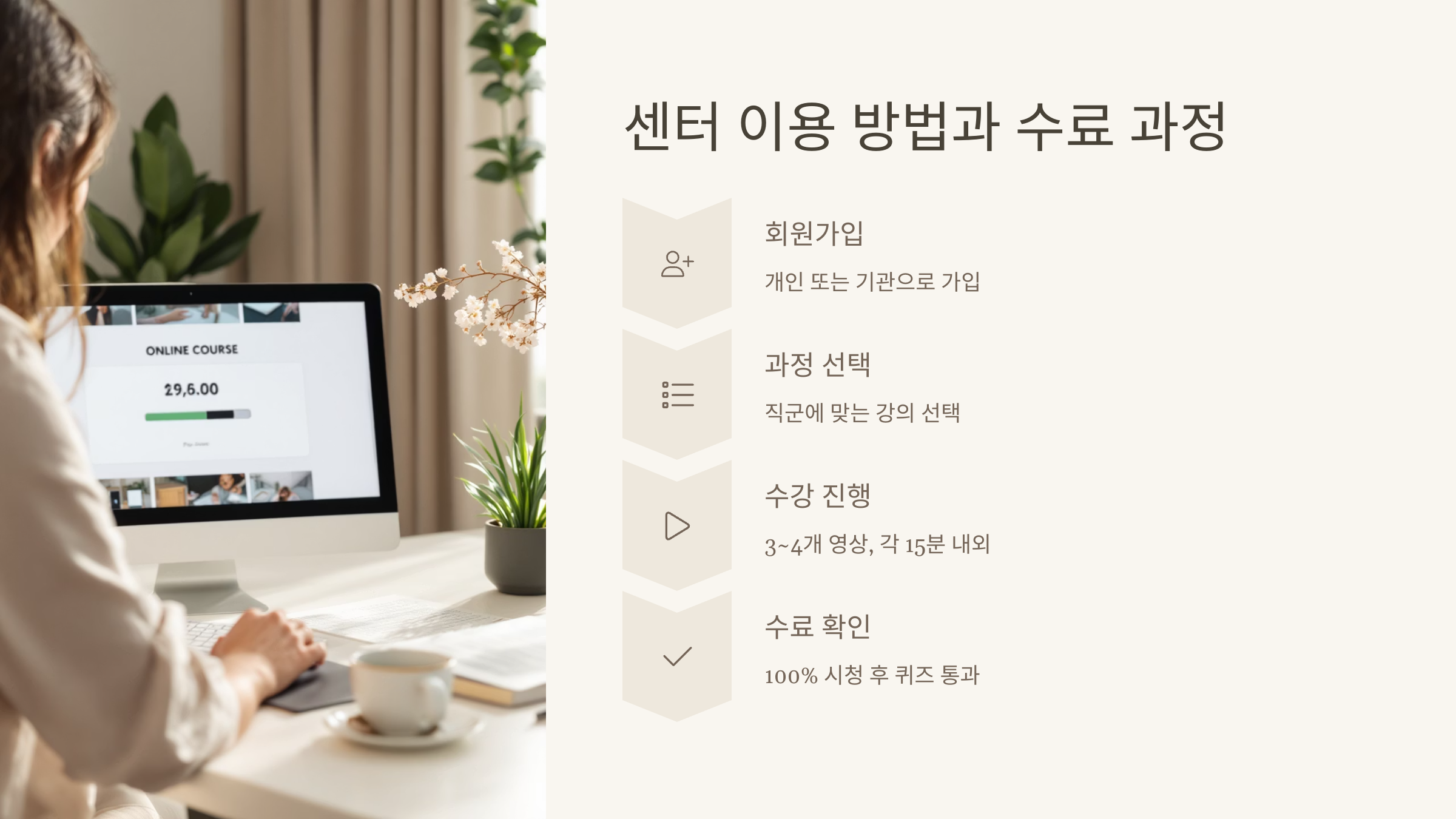 센터에서는 매년 업데이트된 교육 콘텐츠를 제공하고 있어요. 영상 강의, 실사 인터뷰, 퀴즈, 사례 기반 교육 등 다양한 형식이 혼합돼 있어서 지루하지 않고 몰입감 있게 배울 수 있어요. 그리고 수료증 발급이 자동화되어 있어서 수강 완료 후 따로 요청할 필요도 없답니다.