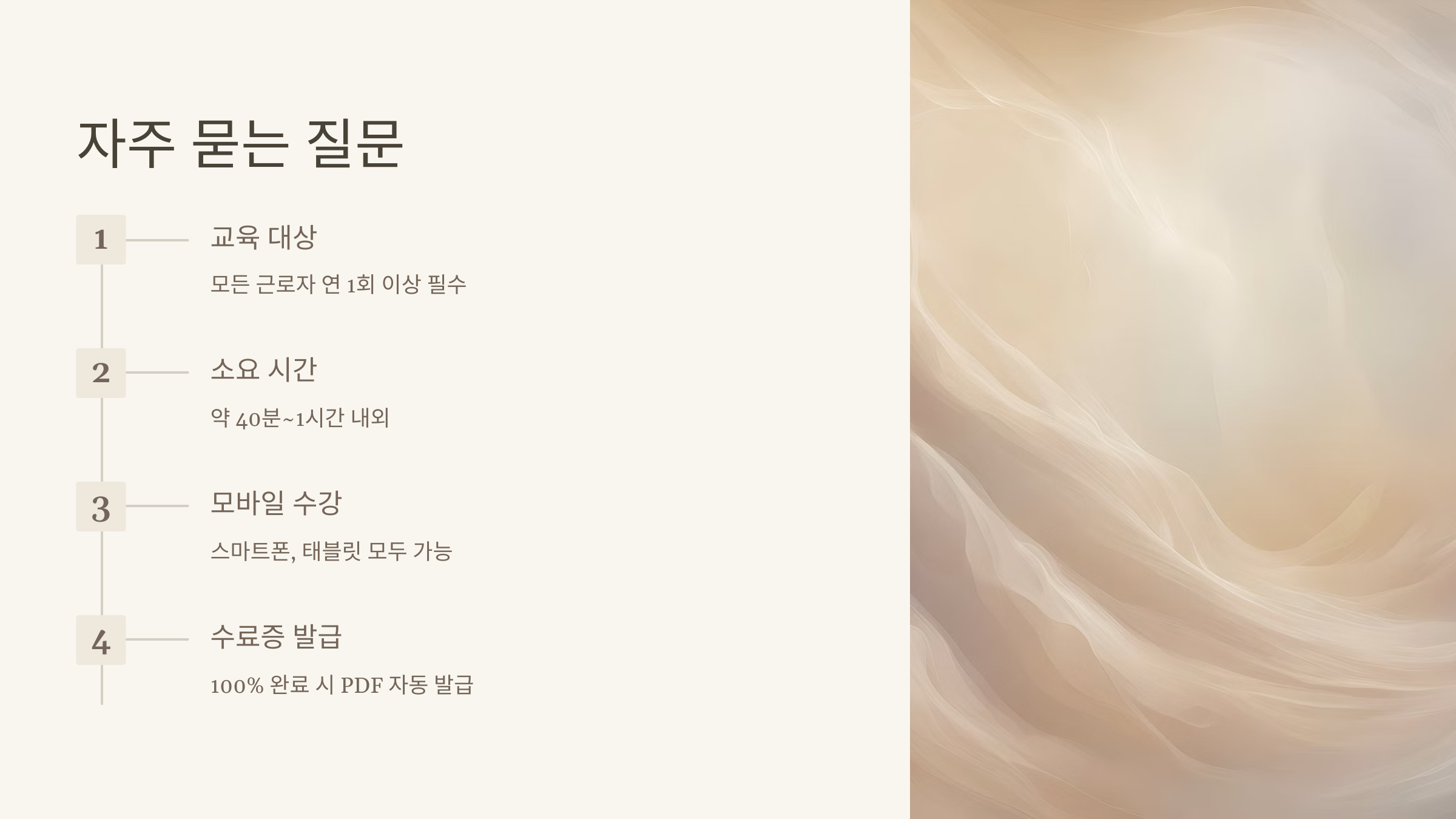 이 교육은 1년에 한 번만 이수하면 되고, 시간은 약 1시간 정도면 충분해요. 강의 수강 후 간단한 확인평가만 통과하면 자동 수료증 발급까지 완료돼서 정말 간단하고 효율적이에요.