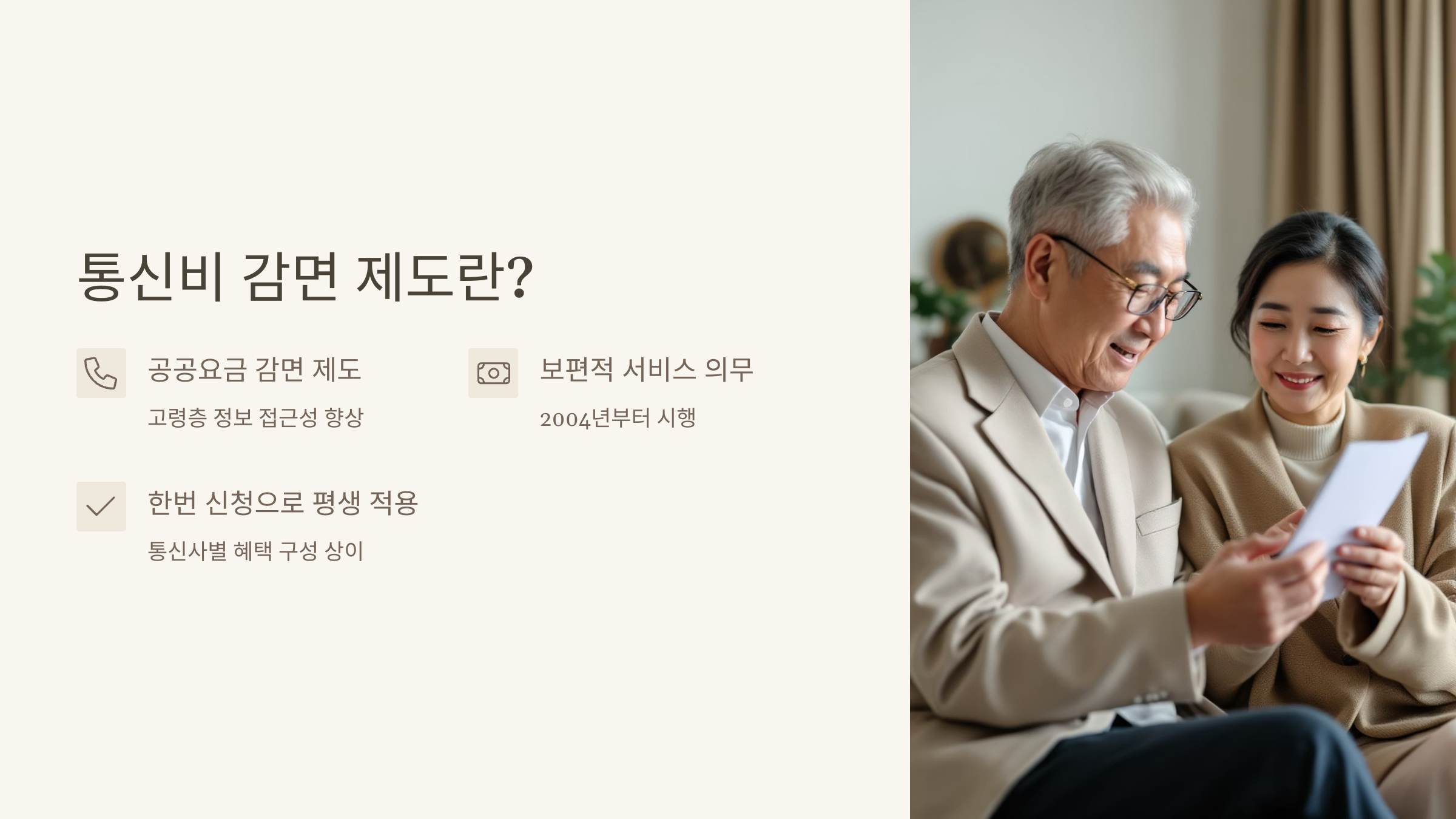 65세 이상 통신비 감면은 정부가 고령층의 정보 접근성을 높이고, 생활비 부담을 줄이기 위해 마련한 공공요금 감면 제도예요. 만 65세 이상 어르신이라면 별도의 소득 조건 없이도 신청만으로 통신비 할인 혜택을 받을 수 있어요.