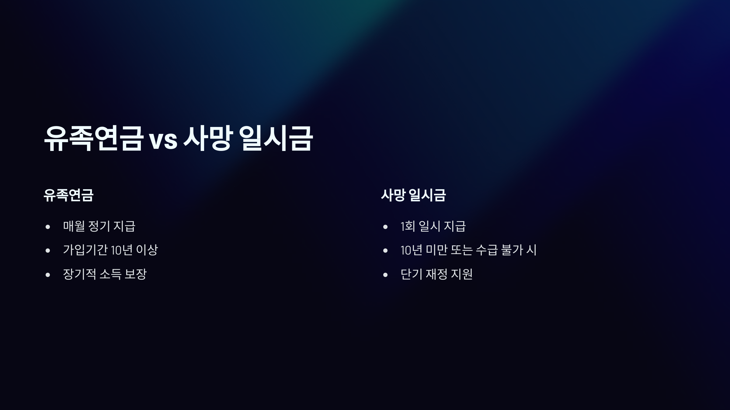 유족연금은 사망한 사람이 일정 가입기간을 채우고 있었고, 소득이 없었을 경우 등 특정 조건에서 매달 받는 연금이고, 사망 일시금은 한 번에 지급되는 구조예요.