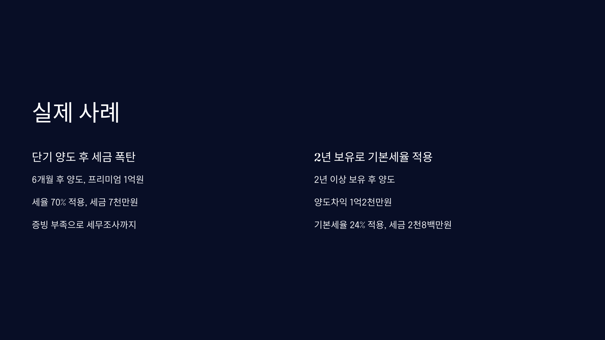 - 2년 이상 보유: 기본 세율 적용, 중과 피하기