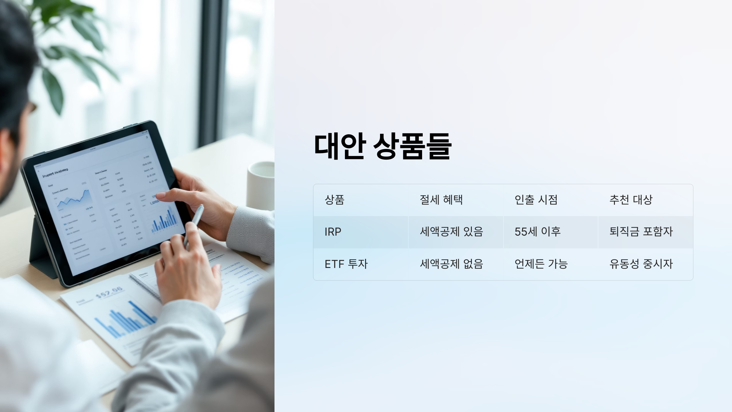 IRP도 세액공제가 되며, 연금저축펀드보다 더 다양한 상품을 담을 수 있어요. 단, 이 역시 55세까지 인출 제한이 있어요.