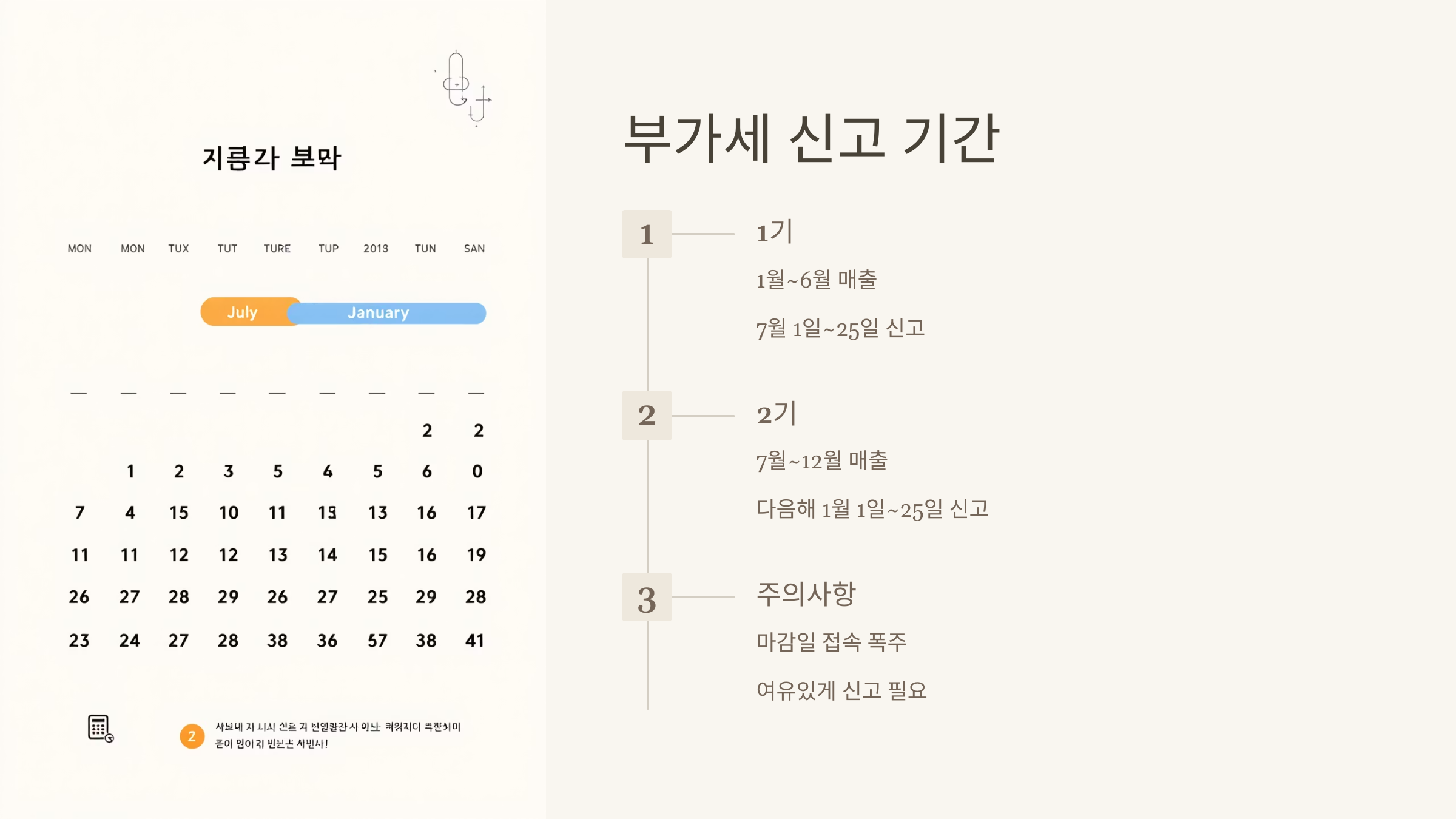 첫째, 신고 기간을 달력이나 알람 앱에 저장해두세요. 부가세 신고는 매년 1월, 7월 정해진 날에 반복되기 때문에 잊지 않도록 자동화해두는 게 좋아요.