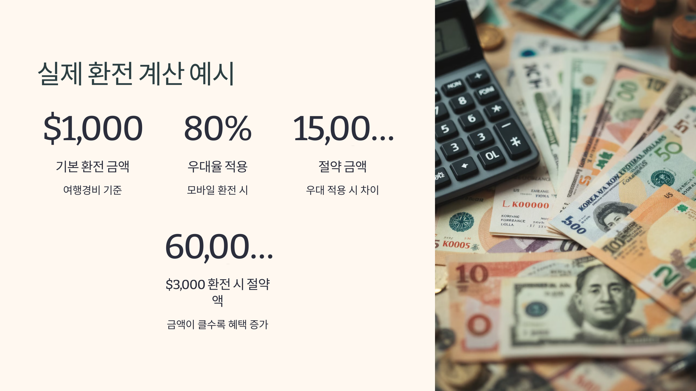 | $1,000 환전 | 1,360원 | 1,345원 (우대 80%) | 15,000원 절약 |