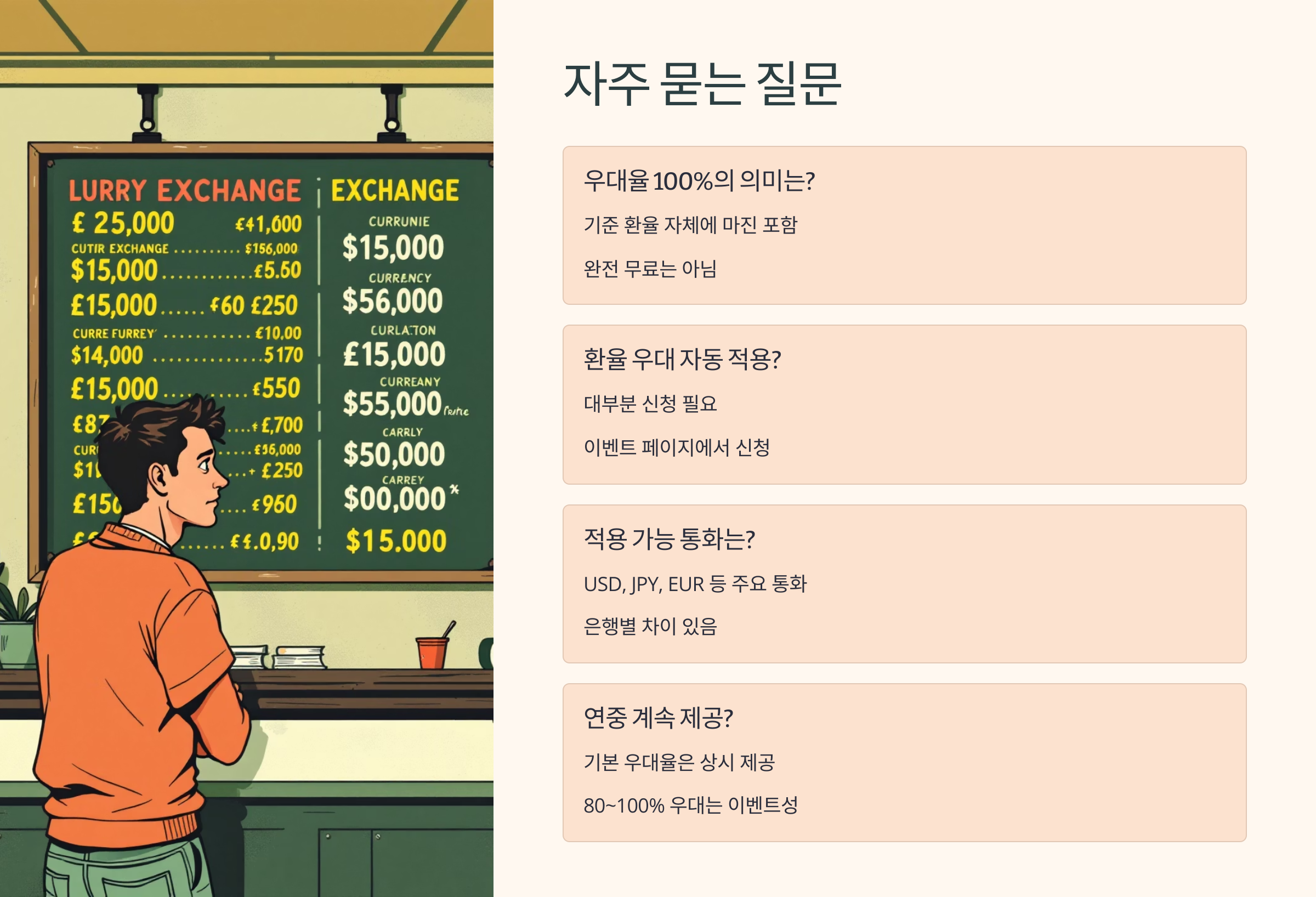 A2. 보통 USD, JPY, EUR 같은 주요 통화에 적용되며, 은행마다 적용 가능 통화가 다를 수 있어요.
